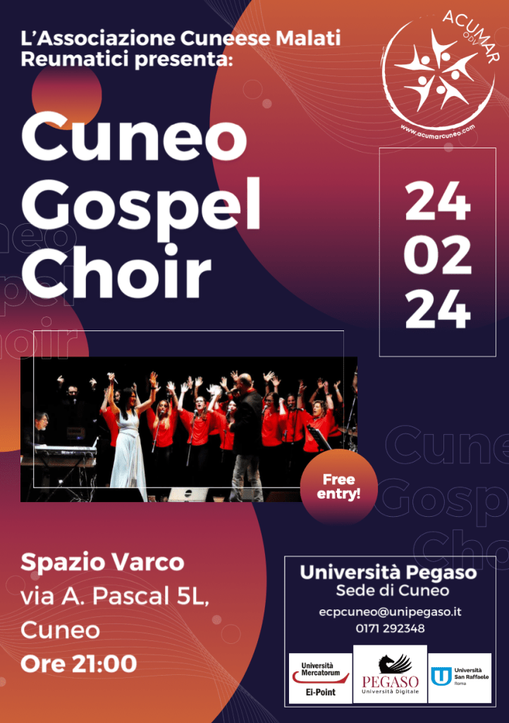 siamo felici di annunciare un evento che vi riempirà di gioia ed emozioni. Il prossimo 24 febbraio 2024, alle ore 21, vi invitiamo calorosamente a partecipare al concerto gospel organizzato presso lo Spazio Varco di Cuneo. La serata sarà arricchita dalle voci del Cuneo Gospel Choir, un gruppo di talentuosi artisti locali che condivideranno con voi un’esperienza unica e coinvolgente.