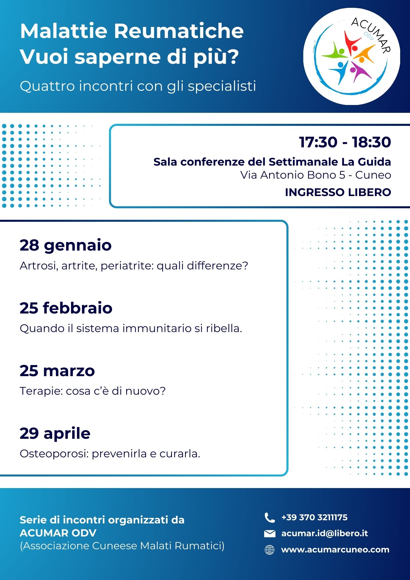 Per ulteriori informazioni, visitate il sito www.acumarcuneo.com o contattate ACUMAR ODV via e-mail all’indirizzo acumar.id@libero.it o telefonicamente al +39 370 3211175.