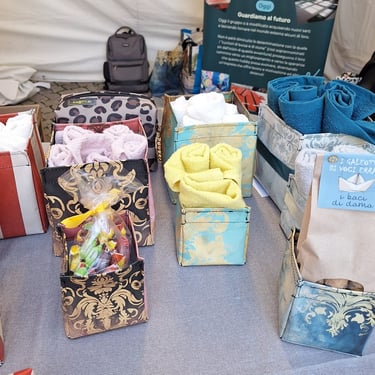 Borse e contenitori portaoggetti realizzati con Are@51Lab, il laboratorio di sartoria interno alla Casa di Reclusione “R. Morandi” di Saluzzo, progetto sociale sostenuto da Liberi Dentro Avp di Saluzzo Odv.