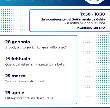 Siamo lieti di invitare la comunità a una serie di incontri informativi dedicati alle malattie reumatiche. L'iniziativa è pensata per fornire approfondimenti su queste patologie, grazie alla presenza di esperti del settore.