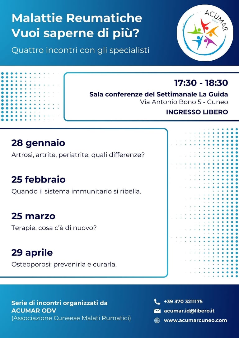 © 2026 ACUMAR – Associazione Cuneese Malati Reumatici. Tutti i diritti riservati. I contenuti, i testi, le immagini e la grafica pubblicati su www.acumarcuneo.com sono di proprietà dell'associazione e ne è vietata la riproduzione, anche parziale, senza autorizzazione scritta.