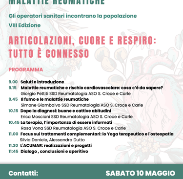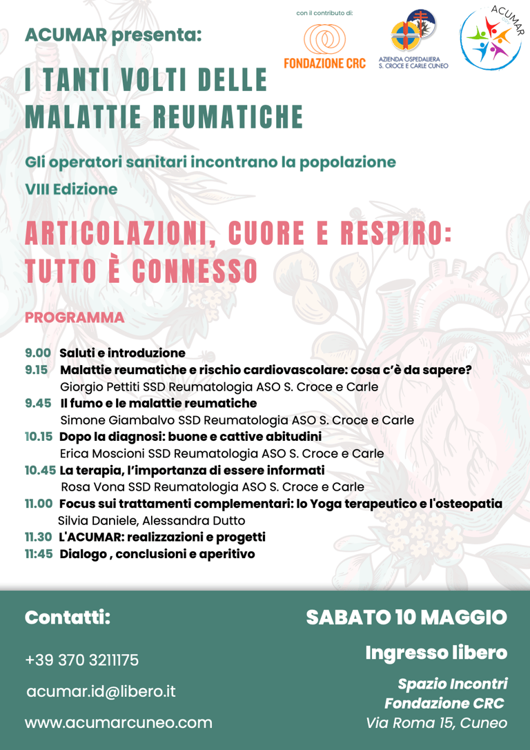 Articolazioni, cuore e respiro: tutto è connesso. Con questo messaggio forte e chiaro, ACUMAR – Associazione Cuneese Malati Reumatici invita cittadini, pazienti e professionisti del settore sanitario a partecipare all’evento “I Tanti Volti delle Malattie Reumatiche”, che si terrà sabato 10 maggio allo Spazio Incontri della Fondazione CRC in Via Roma 15, Cuneo, dalle ore 9:00 alle 12:00. L’ingresso è libero.